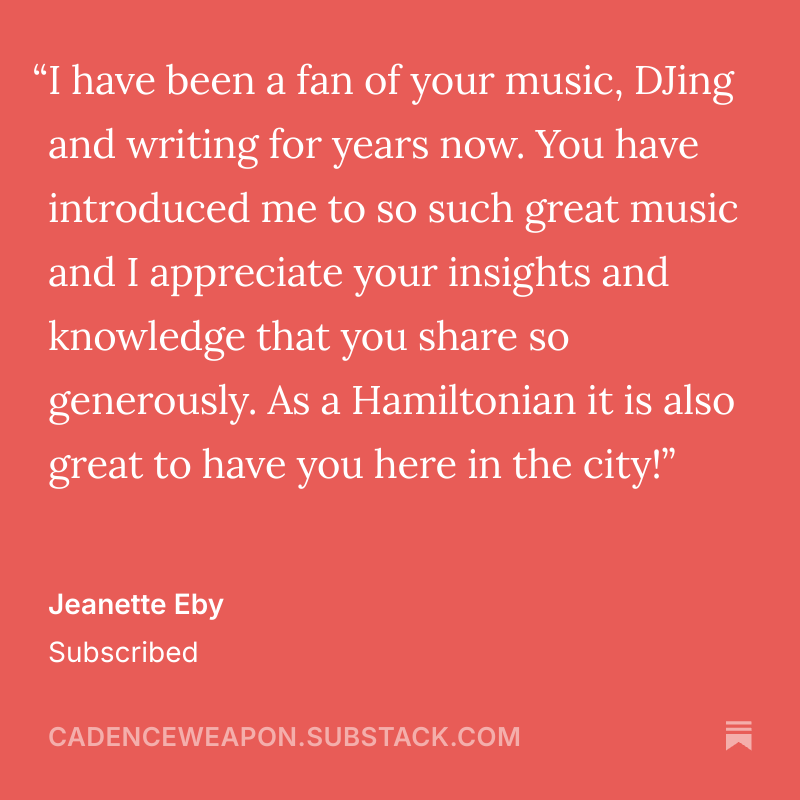 You can find me updating my playlists or hanging on TikTok, Instagram and Bluesky. You can listen to my music on Apple Music, Bandcamp and Spotify. You can get Cadence Weapon merchandise here. Pick up your copy of Bedroom Rapper here and please rate it on Goodreads.